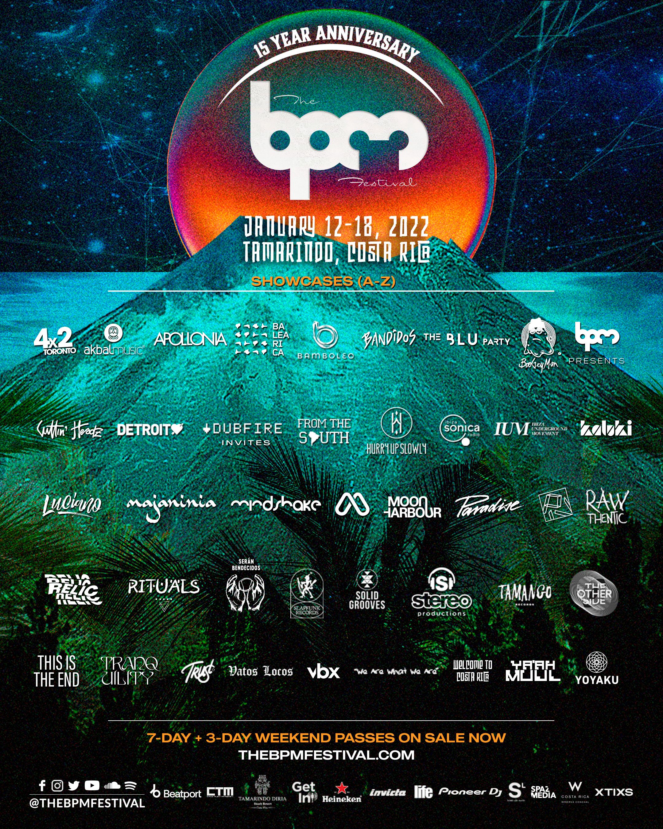 Los showcases recién agregados incluyen Balearica, Rafa Barrios’ Bandidos, From The South, la serie de eventos y sello discográfico de Miami Hurry Up Slowly, White Isle party starters Ibiza Underground Movement, Stereo Productions de España, el sello minimalista de Maher Daniel The Other Side, Tranquility de WhoMadeWho y Yoyaku de Francia. Los showcases ya anunciados incluyen el regreso a Tamarindo de Detroit Love, Kaluki, Luciano & Friends, Mood vs Mindshake y Vatos Locos, para mencionar algunos. La edición del 15to aniversario también contará con el debut en BPM de Jesse Calosso’s Boogeyman, Carlo Lio’s Rawthentic y Michael Bibi’s Solid Grooves más el debut costarricense de The Martinez Brothers’ Cuttin’ Headz y la conocida marca de fiestas en Ibiza de Jamie Jones, Paradise.