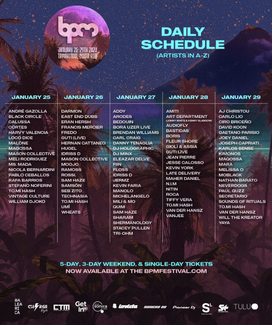 The BPM Festival: Costa Rica ha revelado oficialmente su programación completa para 2023 y sus horarios diarios en previsión de su segunda edición que se acerca rápidamente y que tendrá lugar a finales del mes de enero. Desde el miércoles 25 de enero hasta el domingo 29 de enero, el tan esperado festival y con renombre mundial está programado para hacer su gran regreso a las mágicas y espectacualares playas de Guanacaste, Costa Rica desde su primera edición en 2020. Preparándose para ofrecer 5 días de entretenimiento non-stop, BPM Costa Rica revela más de 90 nombres de clase mundial de los rincones del techno y el house. Junto a Audiofly, Bedouin, Carl Craig, DJ Holographic, Danny Tenaglia, Gioli & Assia, Hernán Cattaneo, Stacey Pullen, Vintage Culture y muchos más pesos pesados de la música dance, se encuentra Amiti, una reunión especial del Art Department con Jonny White y Kenny Glasgow, Boris, Guti (LIVE), Hugel, Joseph Capriati, Pablo Ceballos, Stefano Noferini y una gran cantidad de artistas emergentes y establecidos en los espacios de música dance underground. Los boletos de 5 días, fin de semana de 3 días y de un solo día están disponibles para comprar desde ahora.