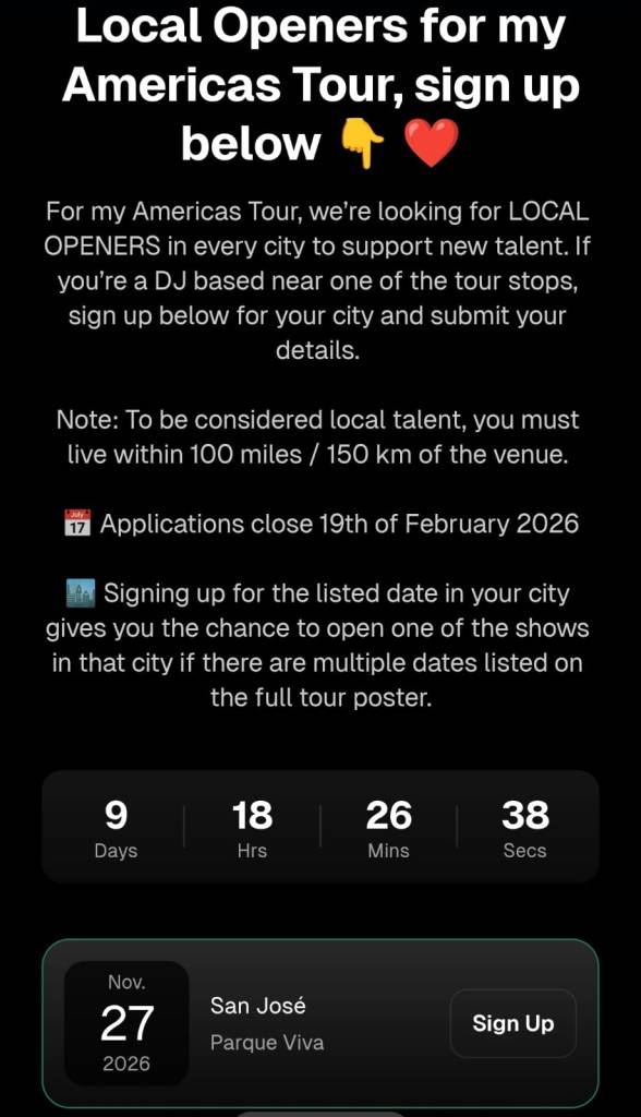 Para mi gira por las Américas, buscamos teloneros locales en cada ciudad para apoyar a los nuevos talentos. Si eres DJ y resides cerca de una de las paradas de la gira, inscríbete abajo con tu ciudad y envía tus datos.
