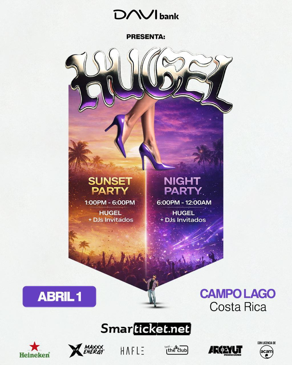 Cuando llega la noche, la pista se transforma. Energía intensa, producción de alto nivel y el sonido internacional de Hugel tomando el control junto a DJs invitados.